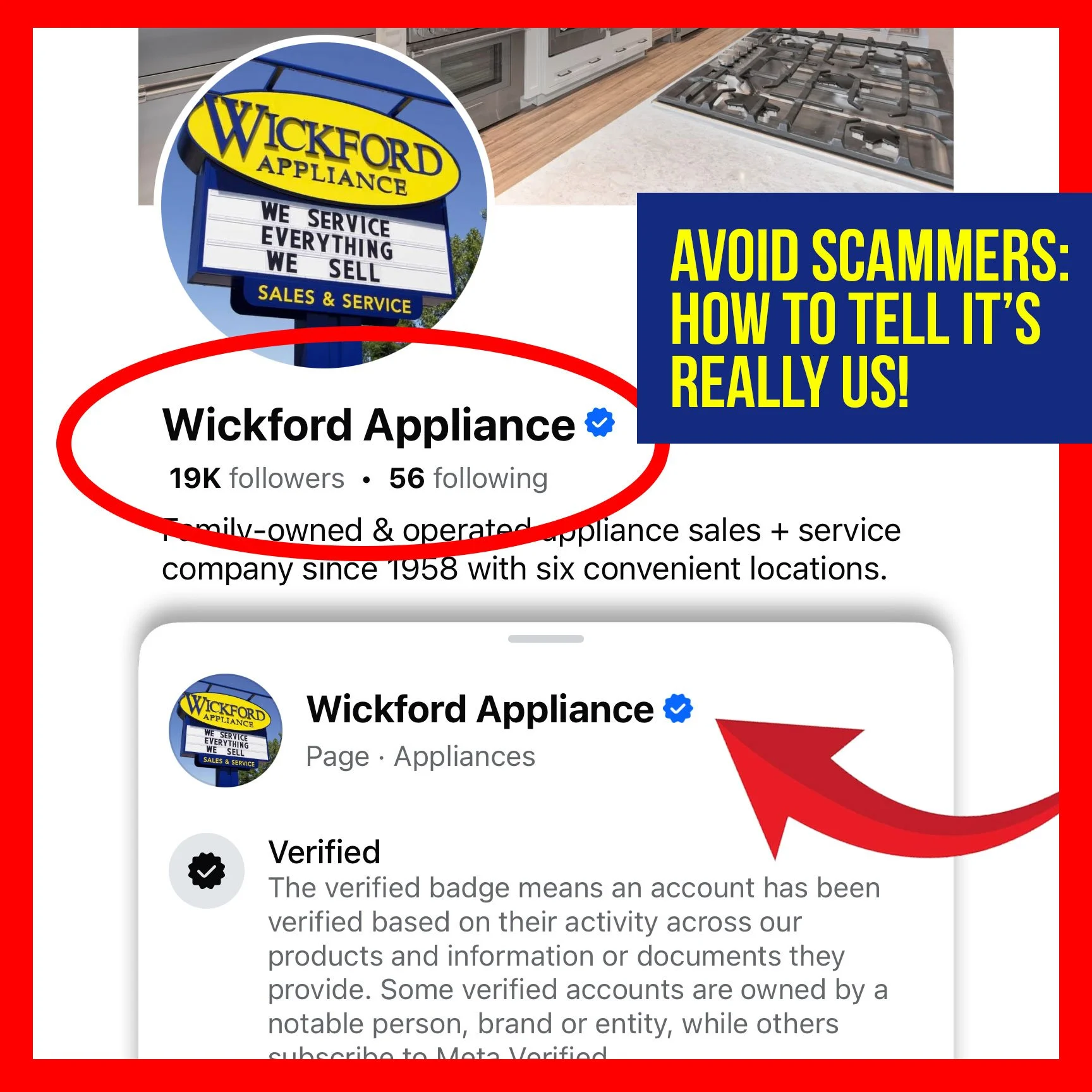 Always be sure you are engaging with the OFFICIAL Wickford Appliance Facebook page by looking for our Blue Verified Checkmark. When you hover over or click the checkmark, you will be provided with our verification details.